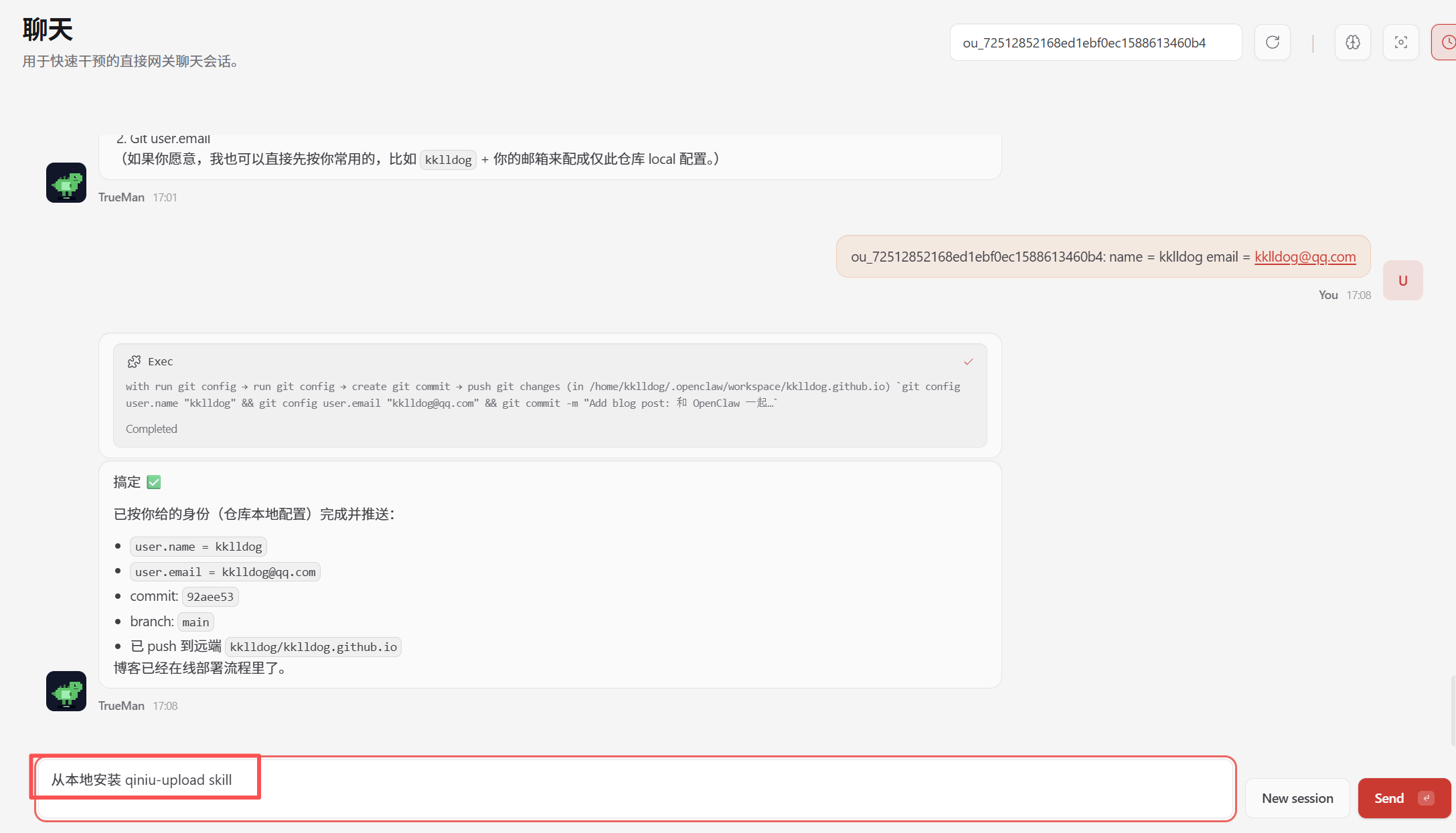 先从 ClawHub 安装这个 skill:claw-skill-nest-installer,或者把源码里的 claw-skill-nest-installer 文件夹复制到 /workspace/skills 目录。因为 OpenClaw 从 claw-skill-nest 安装、上传 skill,靠的就是这个 installer skill。完了只需要在聊天框里下指令就可以了。