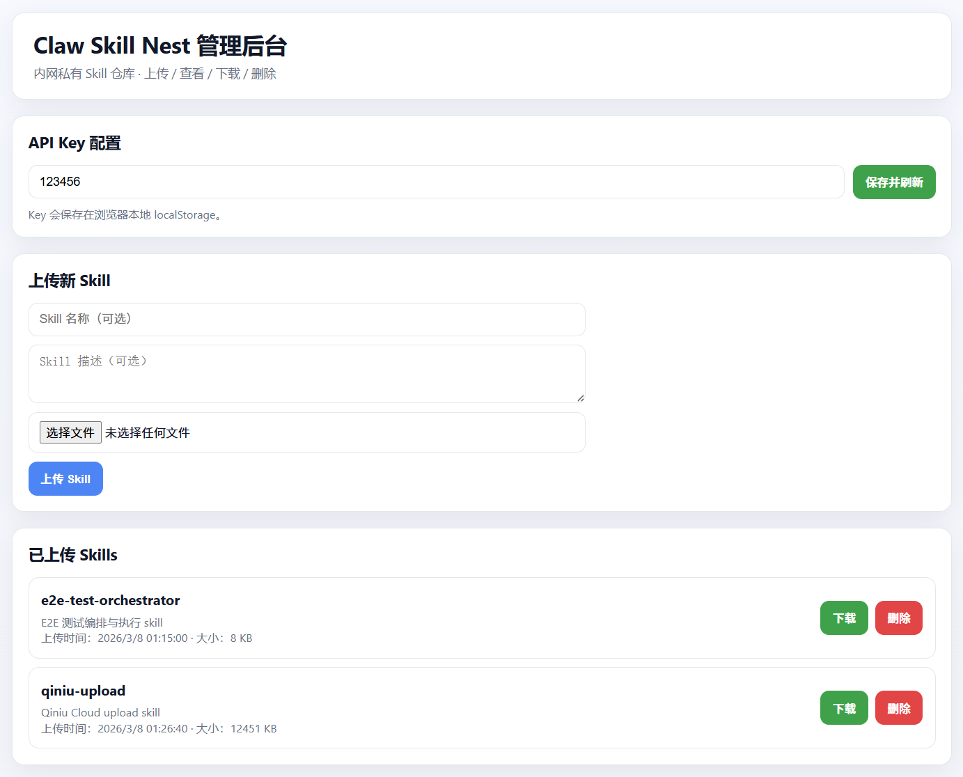 Claw Skill Nest 的定位是在局域网中使用。 下载完代码后,直接启动它