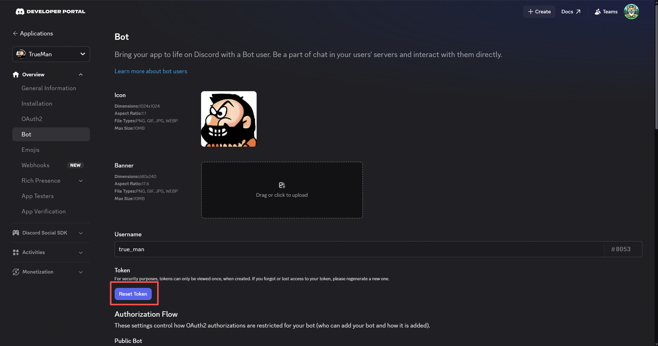 接下来我们需要配置 Bot。进入左侧菜单的 “Bot” 页面,你会看到一个 “Username” 部分,这就是你的 Bot 名称。