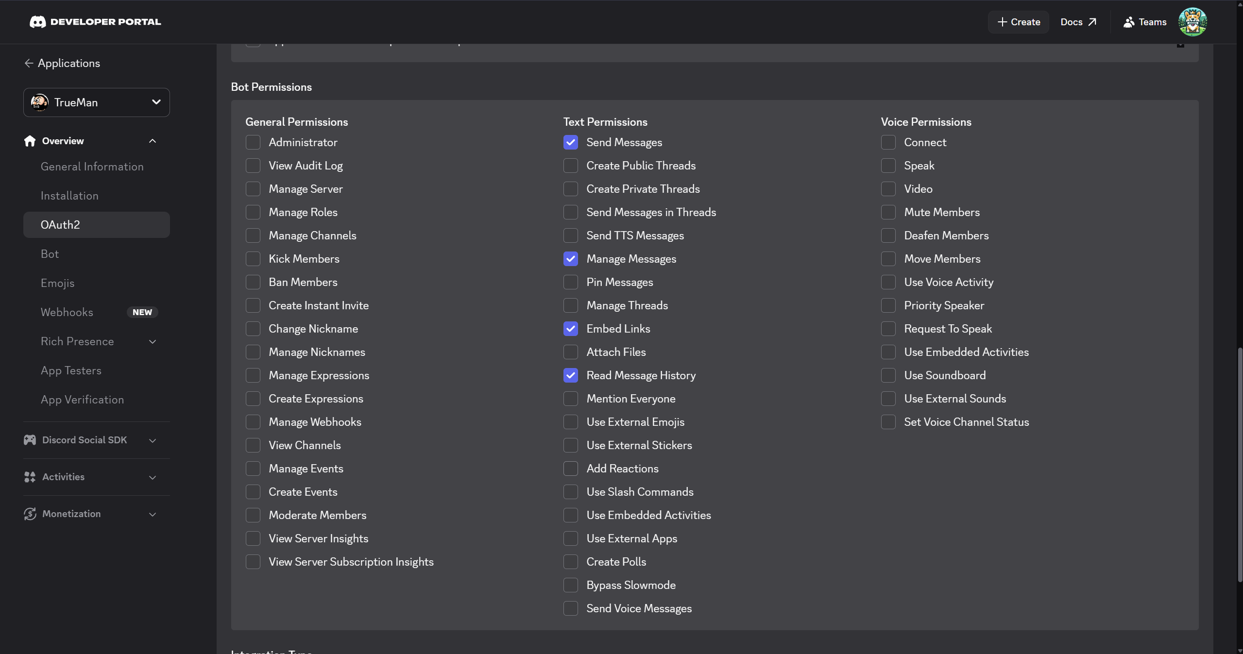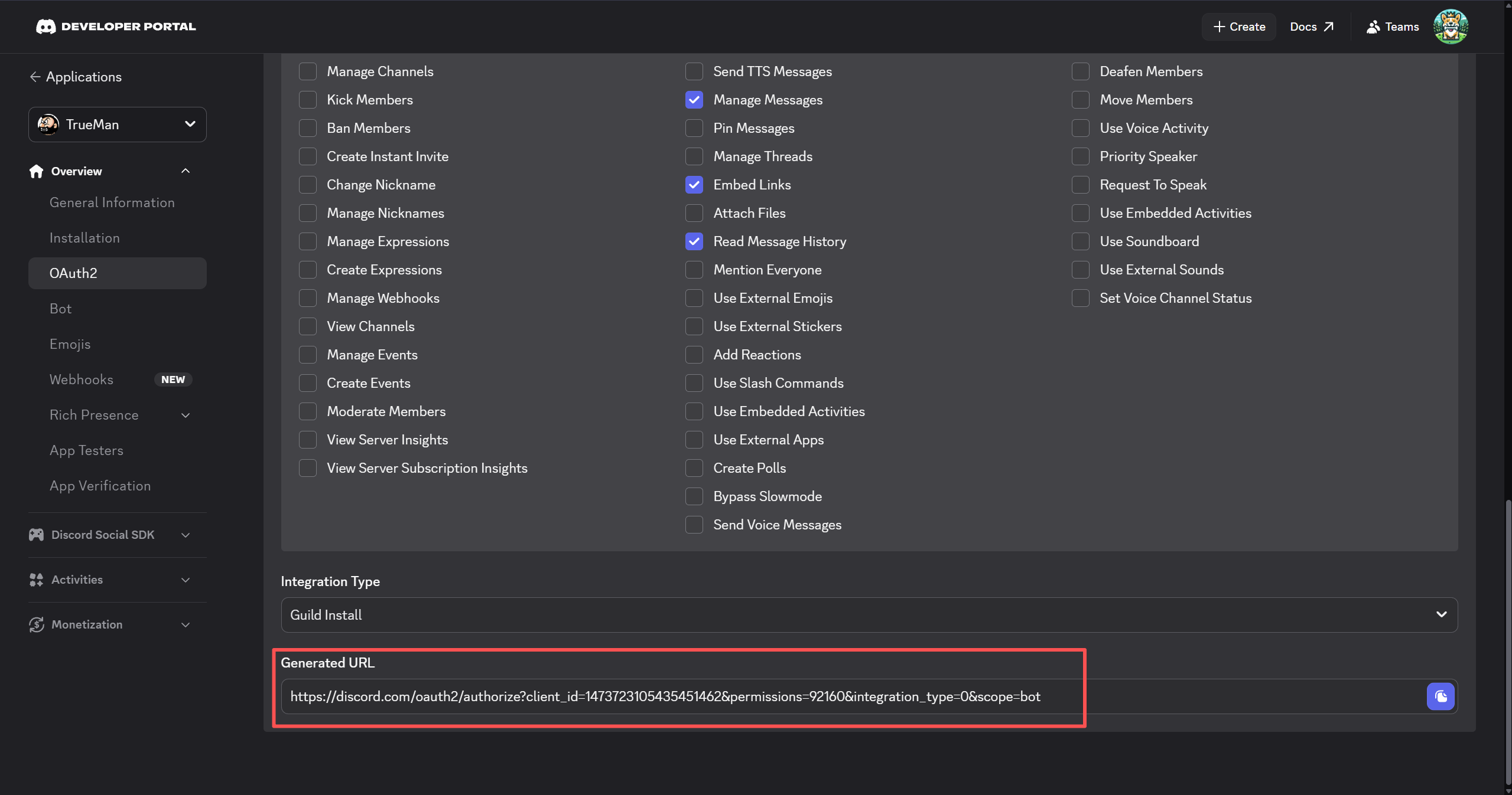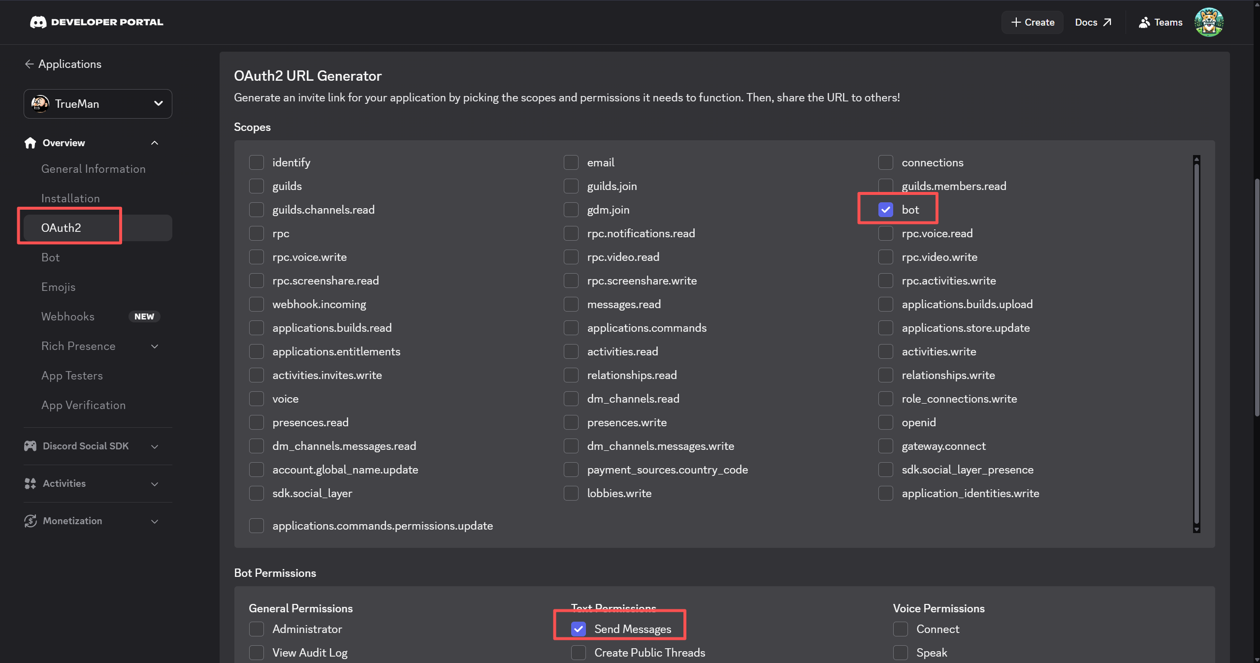 在 “Scopes” 部分,勾选 “bot”。