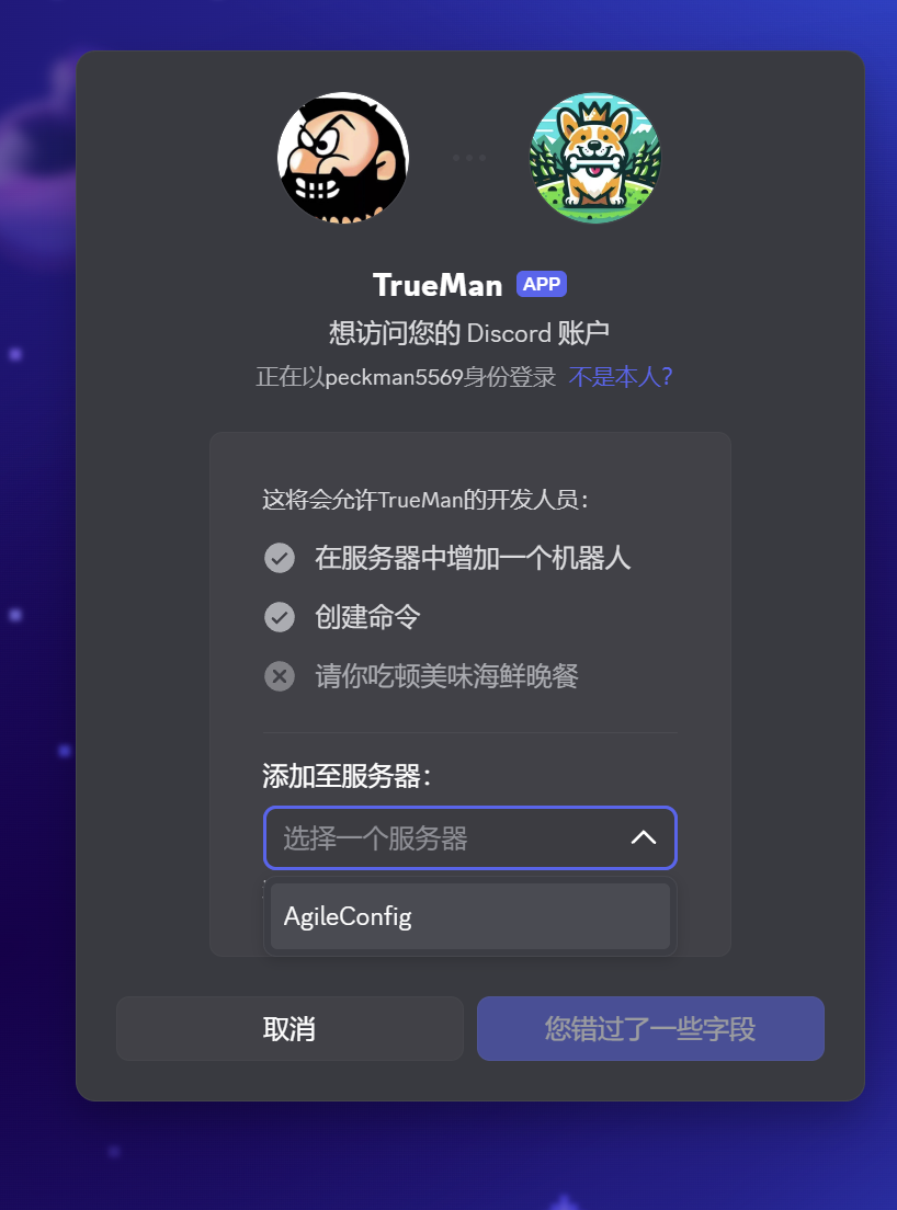 把上面得到的 URL 复制到浏览器地址栏,回车后会弹出服务器选择页面,选择你希望这个 Bot 加入的服务器。