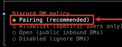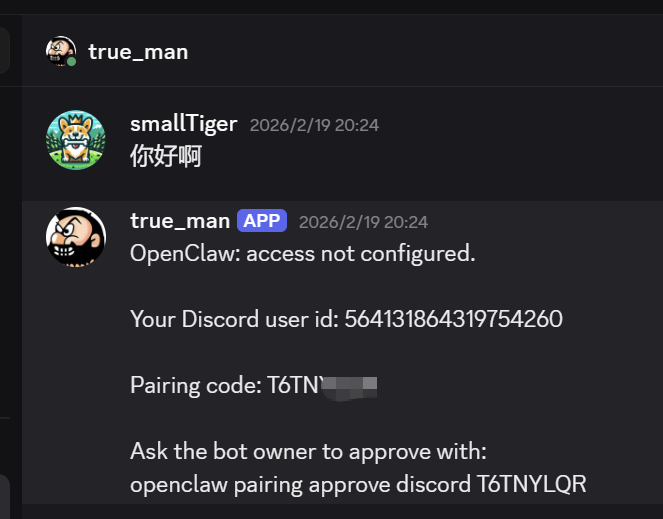 回到 OpenClaw 终端,输入以下命令: openclaw pairing approve discord <Pairing code>